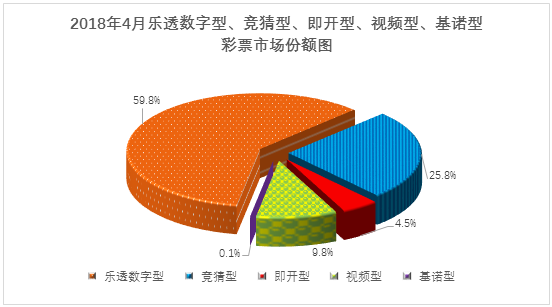 1月至4月累计,乐透数字型彩票销售889.85亿元,同比增加49.01亿元,增长5.8%;竞猜型彩票销售334.90亿元,同比增加80.68亿元,增长31.7%;即开型彩票销售78.22亿元,同比减少7.76亿元,下降9.0%;视频型彩票销售155.41亿元,同比增加2.12亿元,增长1.4%;基诺型彩票销售0.43亿元,同比减少0.18亿元,下降29.3%。1月至4月份乐透数字型、竞猜型、即开型、视频型和基诺型彩票销售量分别占彩票销售总量的61.0%、23.0%、5.3%、10.6%、0.1%。