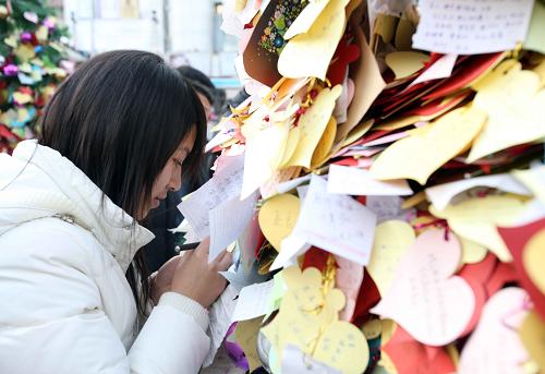 1月1日,一名青年在北京西单商业街上一棵挂满新年祝语的圣诞树旁写下心愿。新年伊始,人们在欢快祥和的气氛中许下美好祝福。新华社记者 袁满 摄