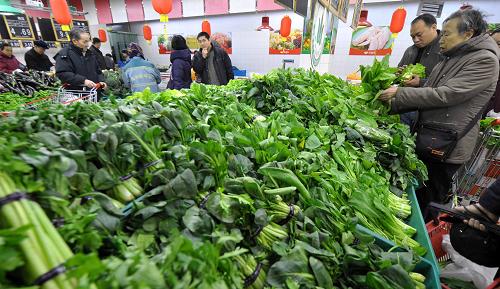 1月3日,市民在乌鲁木齐市青年路好家乡超市内选购新鲜蔬菜。元旦期间,乌鲁木齐市一些大型超市纷纷推出新的促销手段和商品,吸引了众多市民前来采购。在乌鲁木齐市青年路好家乡超市内,每天前来购买商品的顾客超过万人,销售额也比去年同期有所增长。 新华社记者 赵戈 摄