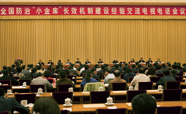 近日,全国防治“小金库”长效机制建设经验交流电视电话会议在北京召开。中央治理“小金库”工作领导小组组长、财政部部长谢旭人出席并讲话,中央治理“小金库”工作领导小组副组长、中央纪委副书记吴玉良主持会议,中央治理“小金库”工作领导小组副组长、审计署副审计长侯凯通报了全国“小金库”治理工作情况。