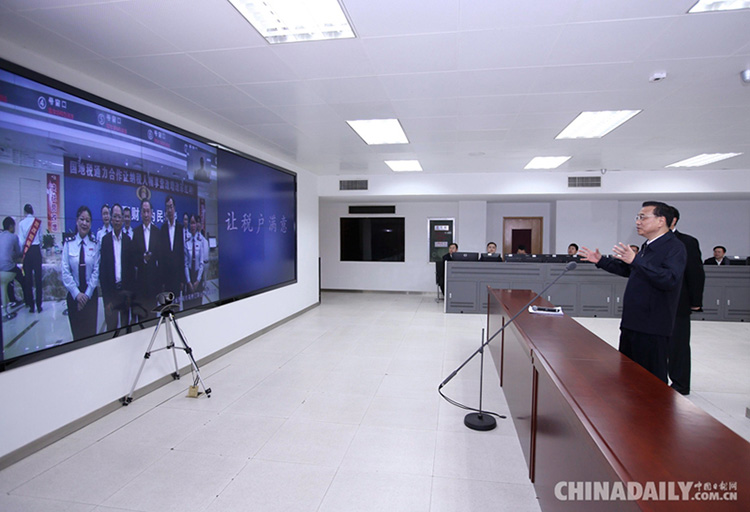 图为李克强总理在税务总局信息系统监控室通过远程电视电话系统和珠海税务工作人员交谈。(中新社 刘震 摄)