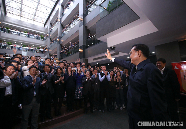 图为李克强总理在国家税务总局一层大厅与税务工作人员见面。(中新社 刘震 摄)