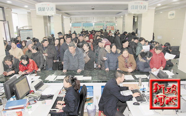 图为:市民在市医保局大厅踊跃参保。