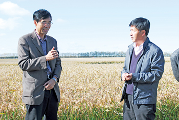 农场场长杨洪仁陪同建三江管局党委书记陶喜军(左),在鸭绿河农场检查指导项目区秋收工作。