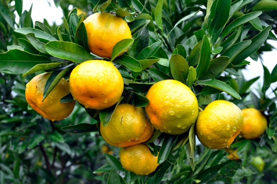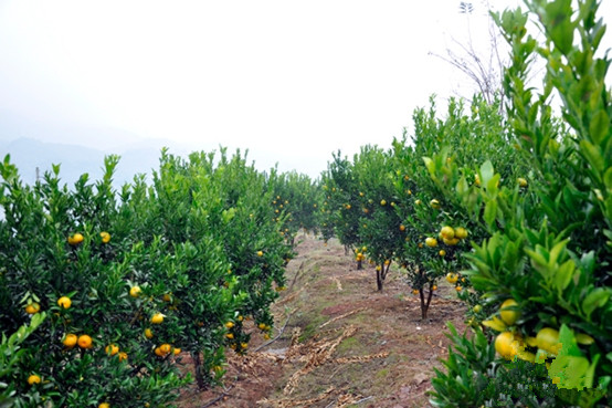 (经过密改稀、高改矮的椪柑树整齐划一、硕果累累)