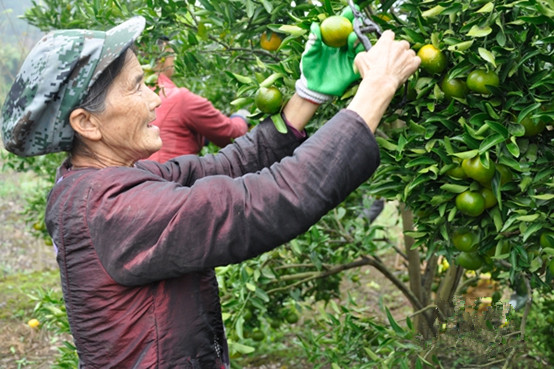 (60多岁的张望玉在椪柑种植大户李圣友的基地里采摘椪柑,每天收入70元)
