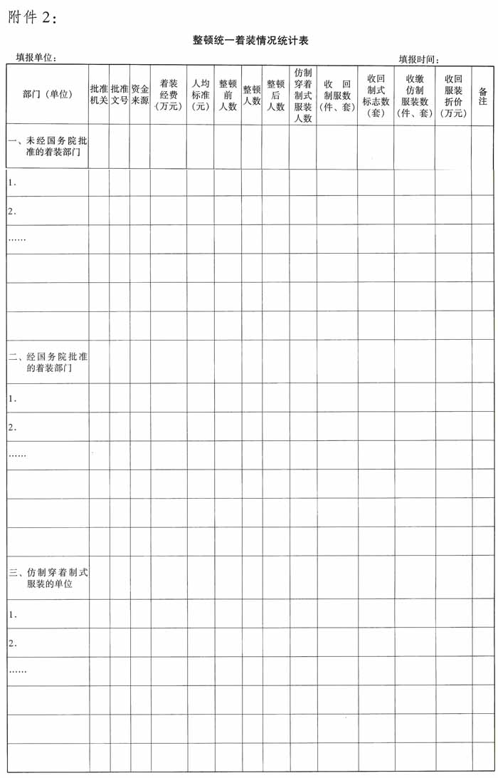 (三)突出重点,加强监督。整顿统一着装工作要从国务院各着装部门抓起,重点整顿未经国务院批准着装的、擅自扩大着装范围的着装部门及人员。同时,也要对社会有关单位所配发的行业标志服或工作服与国务院批准的统一制式服装颜色、式样相雷同的行业及人员着装进行纠正。