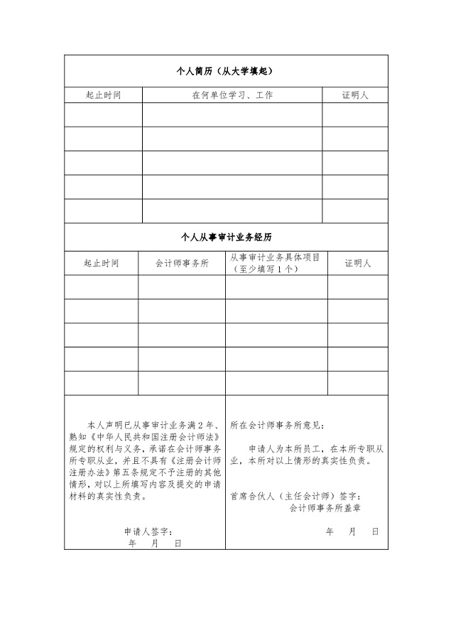 第六条 申请人申请注册,应当通过其所在的会计师事务所,向会计师事务所所在地的省级注册会计师协会提交注册会计师注册申请表(附表1):