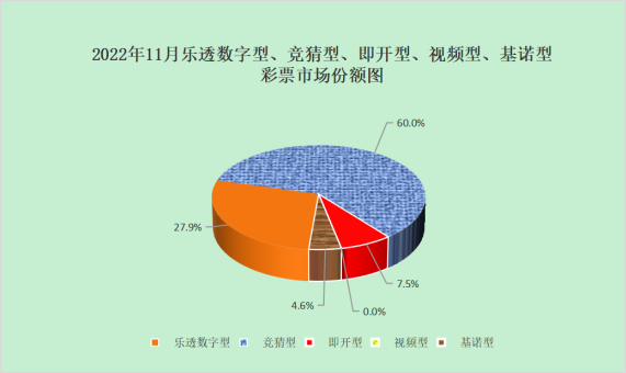 11月份,乐透数字型彩票销售144.79亿元,同比增加6.49亿元,增长4.7%;竞猜型彩票销售310.81亿元,同比增加195.48亿元,增长169.5%;即开型彩票销售38.88亿元,同比减少15.59亿元,下降28.6%;基诺型彩票销售23.96亿元,同比增加0.99亿元,增长4.3%。11月份,乐透数字型、竞猜型、即开型、基诺型彩票销售量分别占彩票销售总量的27.9%、60.0%、7.5%、4.6%。视频型彩票销售0.0002亿元,同比减少0.0003亿元。